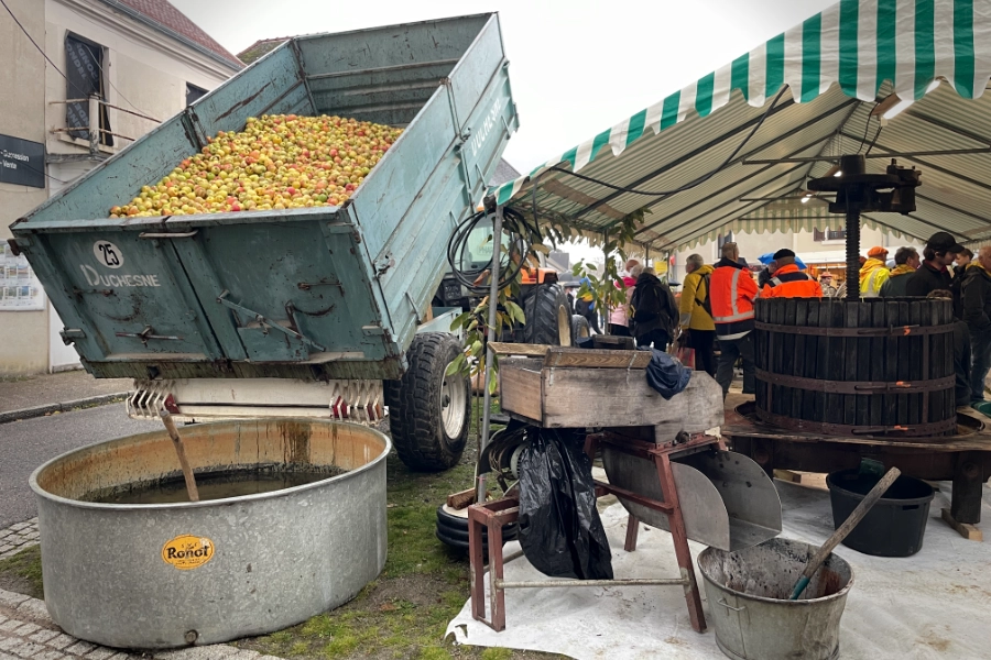 Right in the middle of all the chestnut madness sits this enormous wooden apple press, and honestly, it’s beautiful mechanics. They press 15 tonnes of apples over the festival weekend. Fifteen tonnes. That’s not a typo. Local apples, pressed on site, turned into fresh cider while you stand there watching. Because obviously you need fresh cider when you’re eating chestnuts.