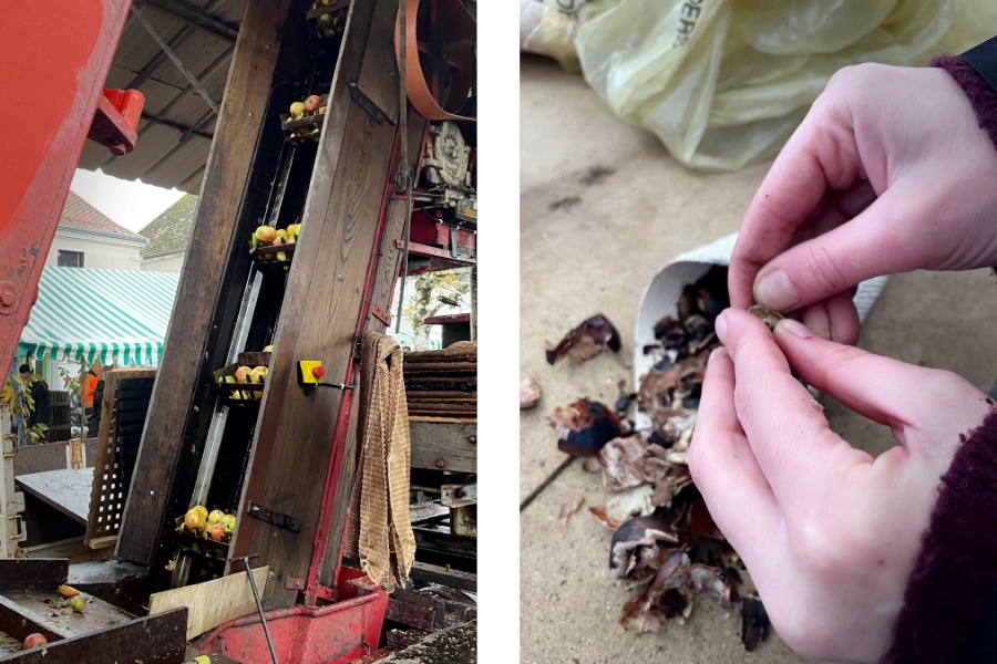 The press itself is beautiful in that functional, been-doing-this-for-centuries way. Huge wooden screws, metal catches, the whole thing groaning and dripping as they crank it down. It’s pretty awesome to watch juice pour out of crushed apples live, especially when you know you’ll be drinking it. You could buy a 1,5 liter bottle of cider that was literally apples a minute ago.