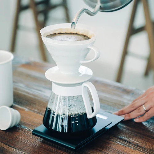Then there is my tiny morning trustee, my Hario V60 in ceramic. The ceramic pour-over dripper sits directly over my espresso cup. One filter, one pour, brilliant coffee, done.