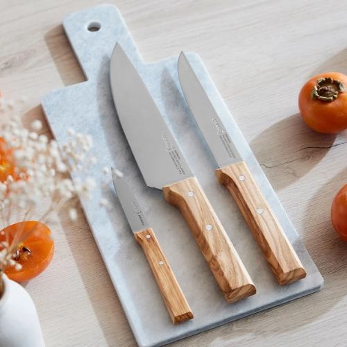 This is the traditional line. Beechwood handles, stainless steel blades, half-tang construction. They look like French kitchen knives are supposed to look. The handles are comfortable. The blades are sharp. The balance is good. They’re affordable, you can build a proper kitchen knife set without spending a fortune. Available with standard beechwood or olive wood handles. The olive wood versions are gorgeous but cost a bit more.
